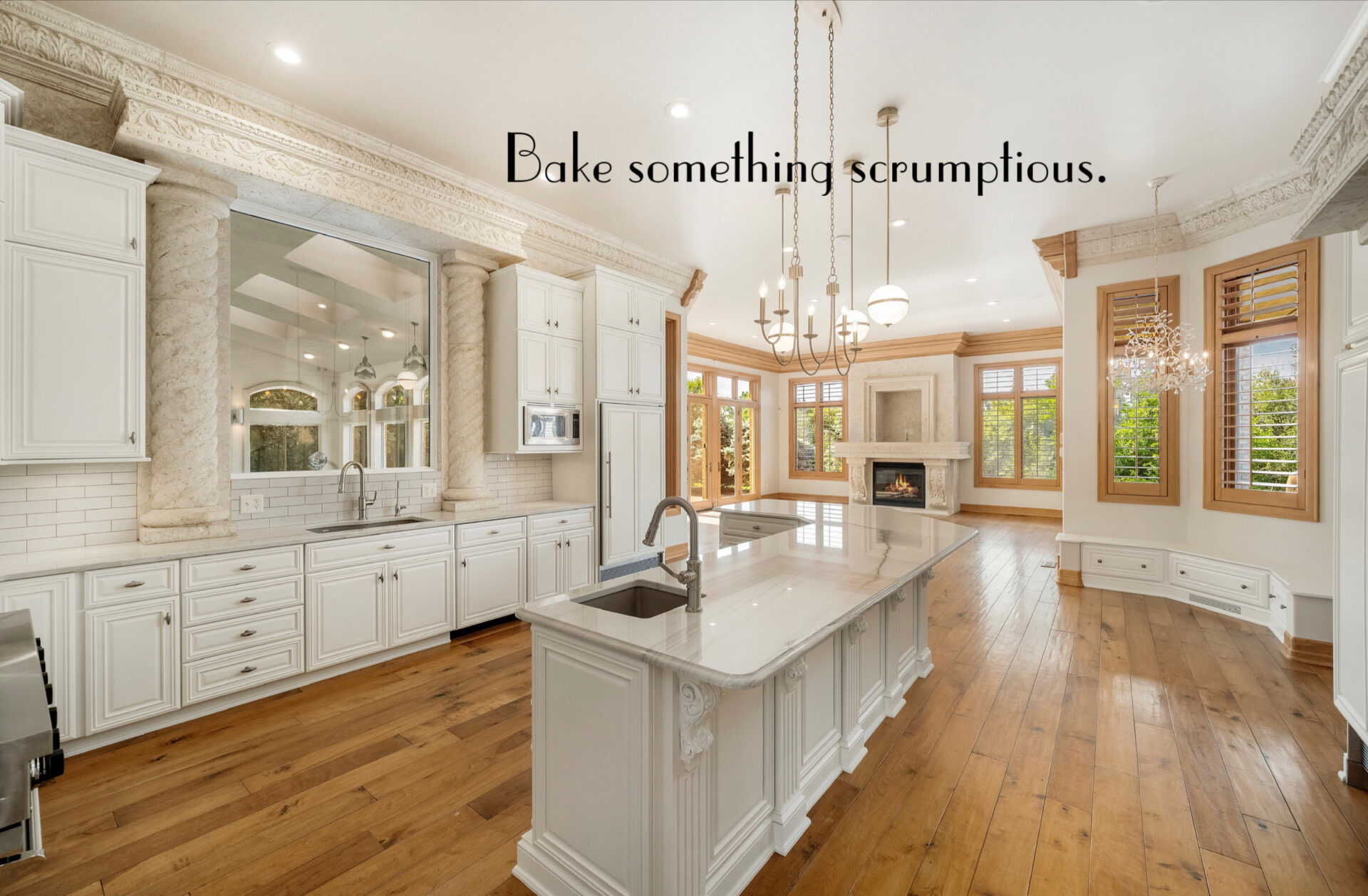 The kitchen has its own fireplace and is open to the main-floor living room.