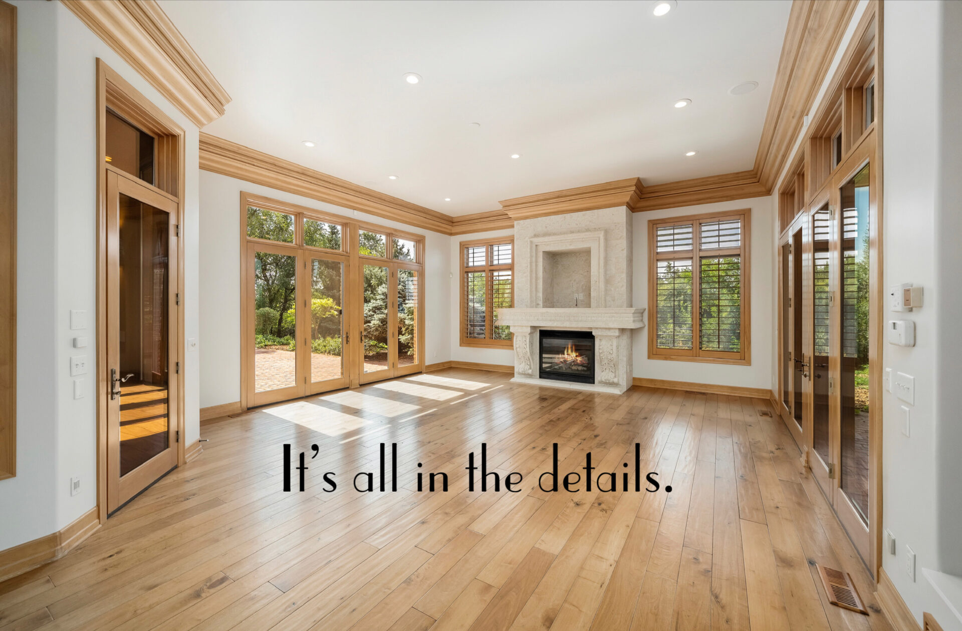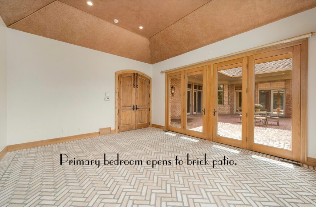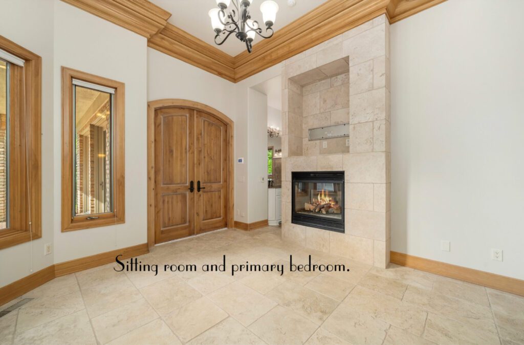 The serene owner’s suite with a sitting room and fireplace is the perfect retreat.