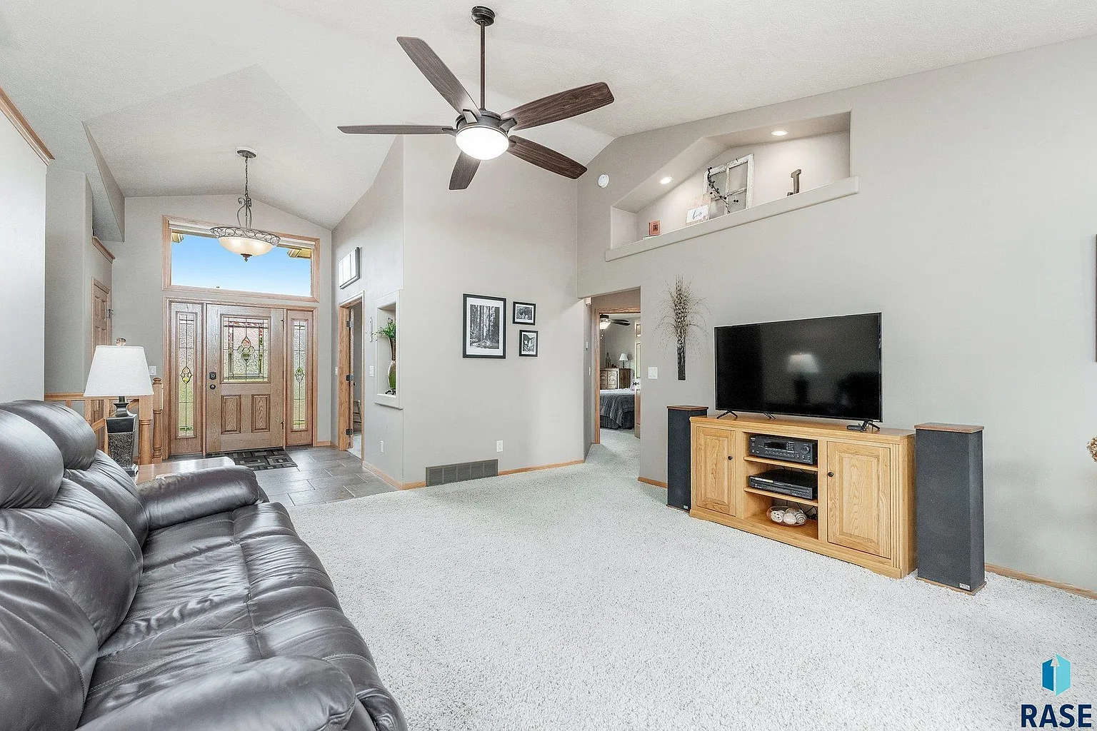 A sun-filled foyer leads to a large living room accented with a stunning vaulted ceiling.