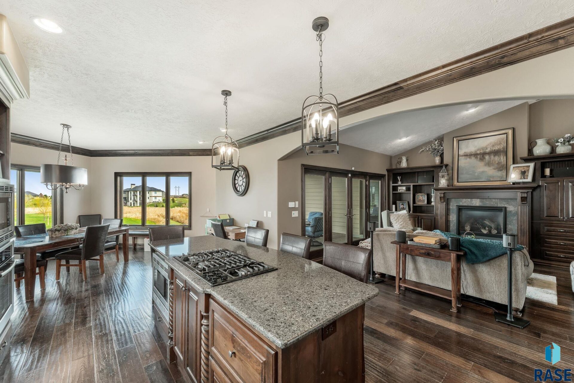 An open kitchen features custom cabinetry, a gas range and sizable island.