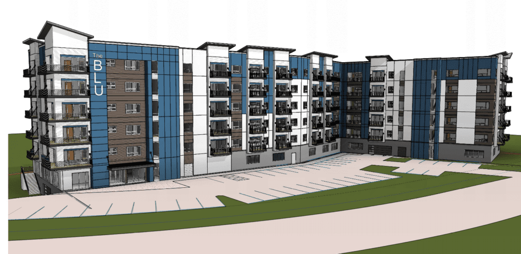 The Blu on Lorraine is being designed as a six-story building of about 125 apartments on the north side of the man-made lake in the development. It will incorporate a wellness theme and smart technology, along with complementary waterfront recreation opportunities that will be right outside residents’ doors.
