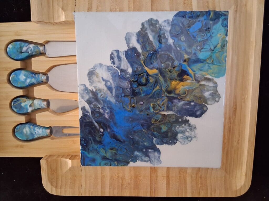 Items: Hand-blown designs on coasters, trivets, cutting boards, charcuterie boards and trinket boxes