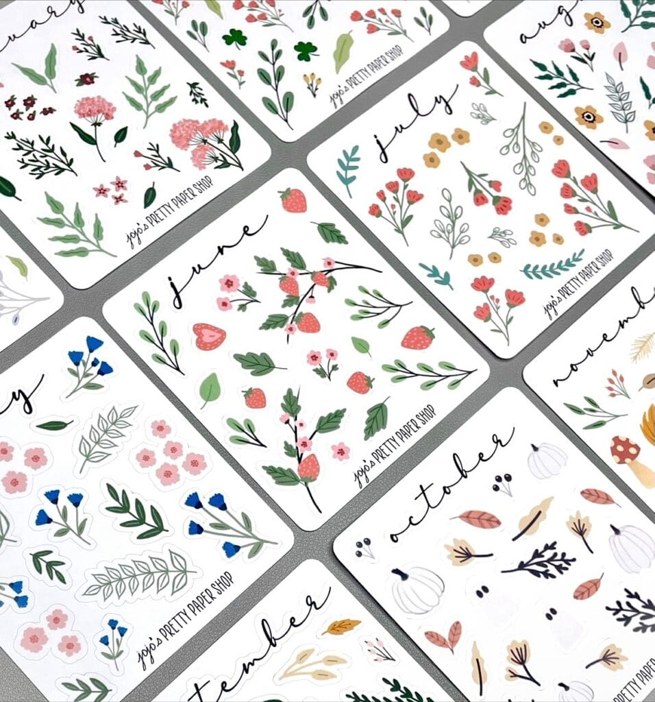Items: Hand-drawn original illustrations on sticker sheets, vinyl stickers, book trackers, blank cards, calendars, sticker books and Christmas ornaments