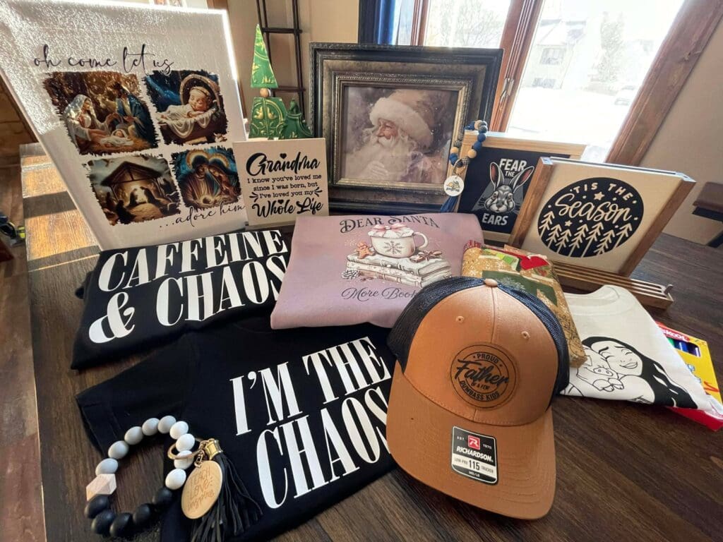Items: Interchangeable canvas signs and frames, apparel for all ages, caps with patches, washable coloring T-shirts, beaded wristlets, blind date with a book for all ages and holiday canvas pictures