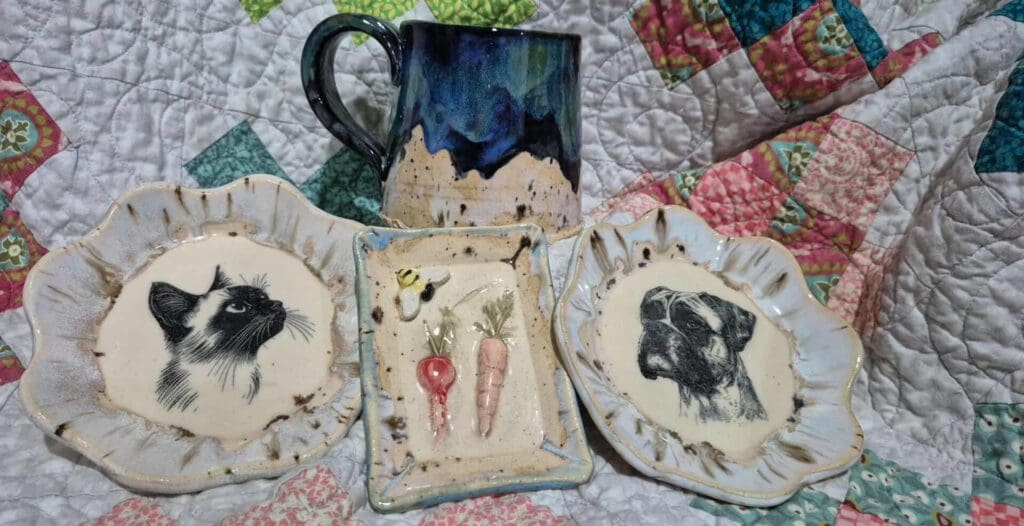 Items: Pottery with a colorful, whimsical twist and a bit of snark