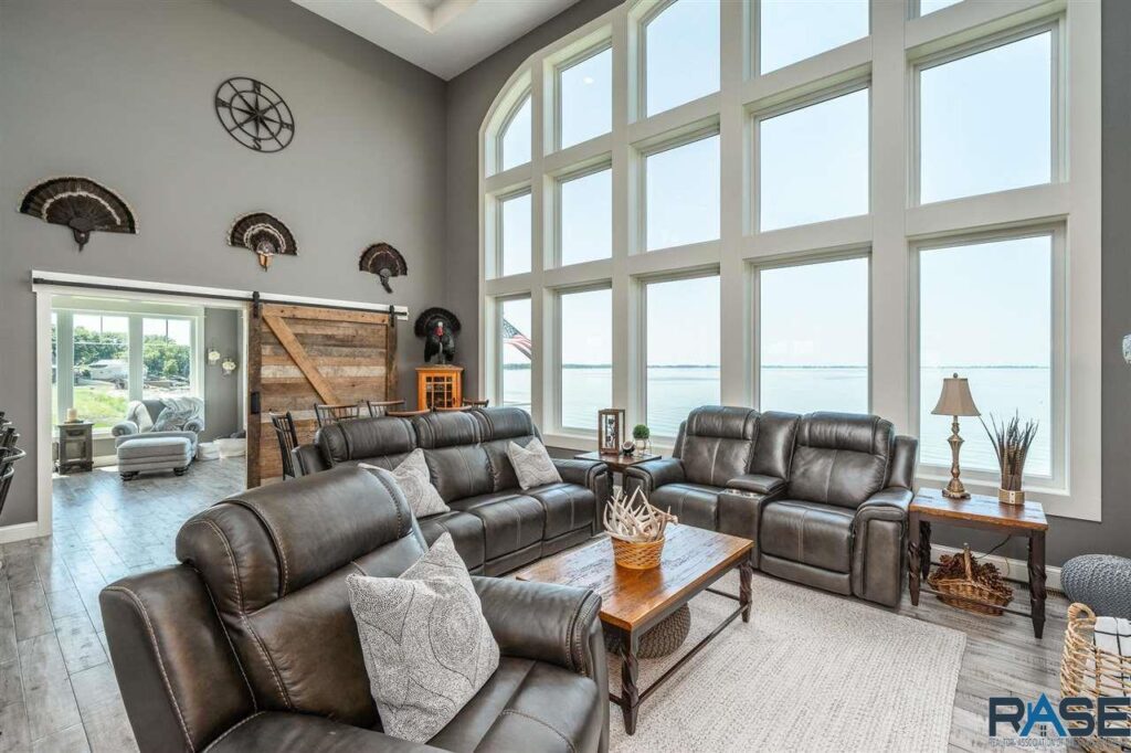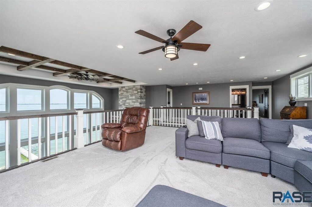The lofted upper level boasts a living room with an unbelievable view of the lake.