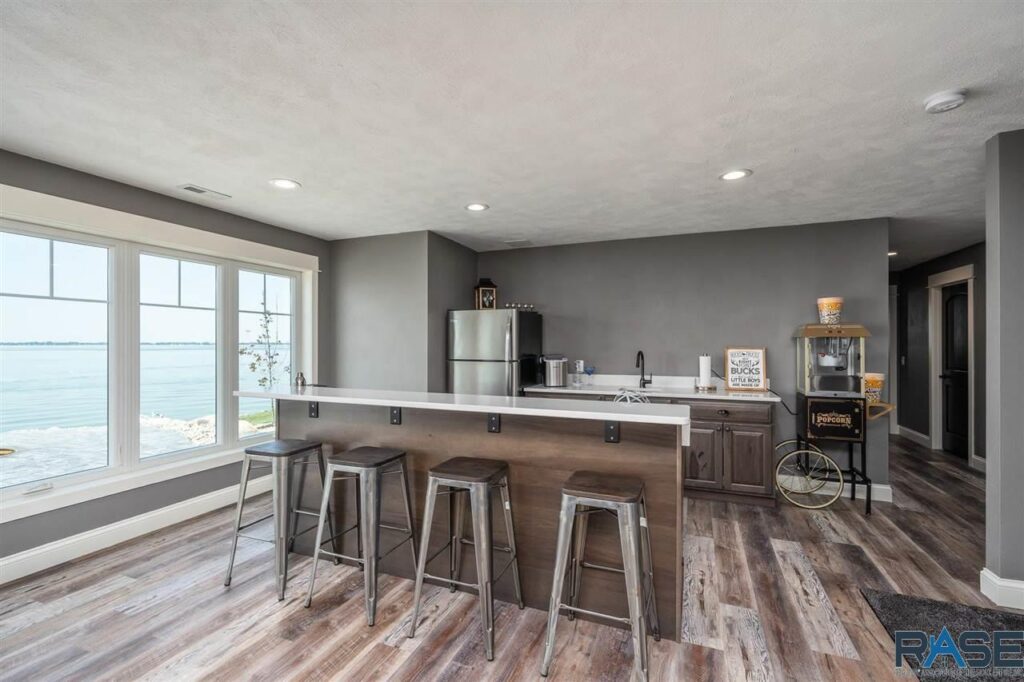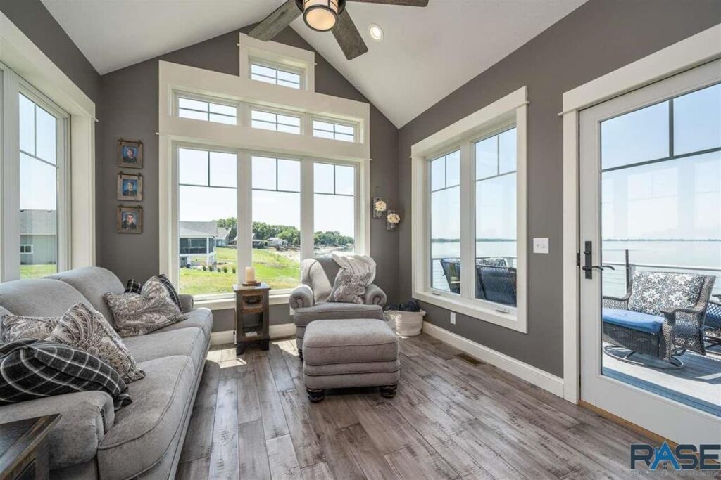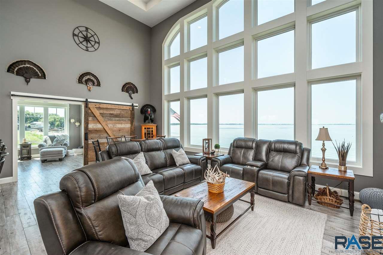 Located on 100 feet of waterfront with an address of 112 Sunset Park Drive, Estelline, the home features a flowing floor plan that highlights the kitchen, dining, family room and sunroom on the main level.