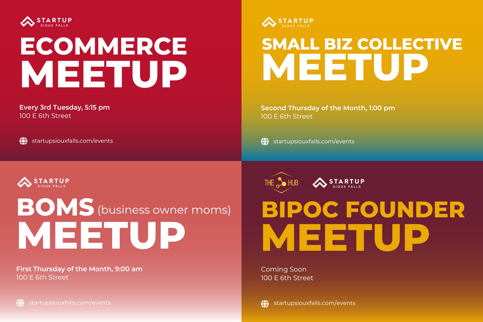 Meetups are community events led by Startup Sioux Falls members that cater to specific groups or interests. A few examples are the Small Business Collective, Software Devs, Business Owner Moms (BOMS), BIPOC Founders, and eCommerce, but we hope to see even more of these groups starting up soon. Check out our event calendar to see when the next meetup is taking place! Also, if you have an idea for a meetup that would fill a gap in Sioux Falls, let our community coordinator, Amos, know.