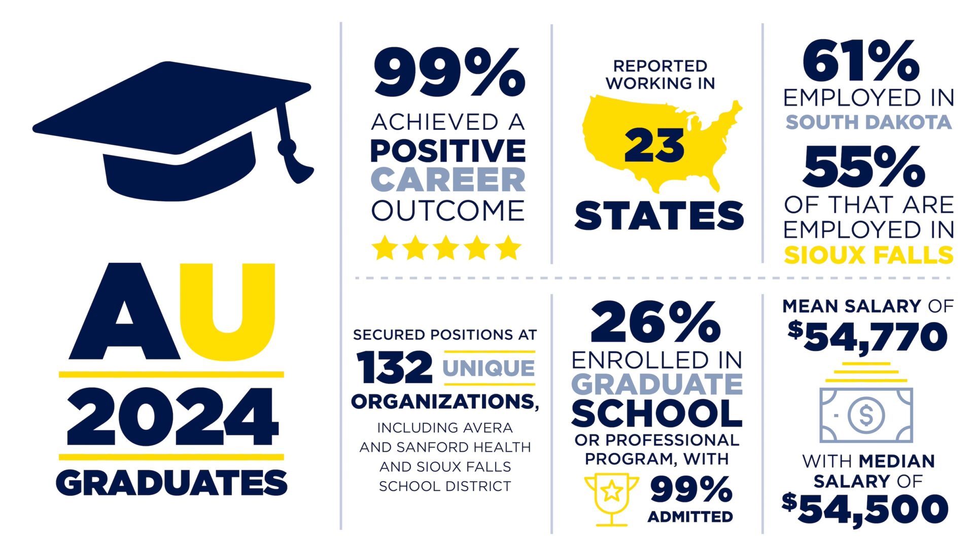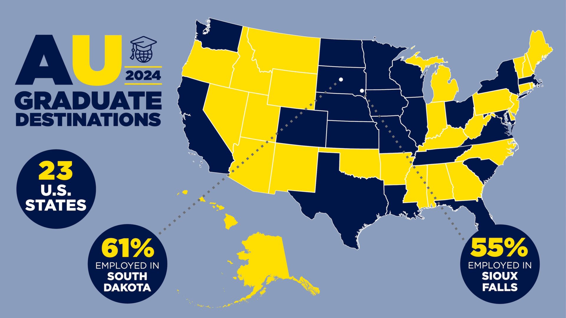 - South Dakota retained 61 percent of AU’s full-time graduates, including 55 percent working in the Sioux Falls area.