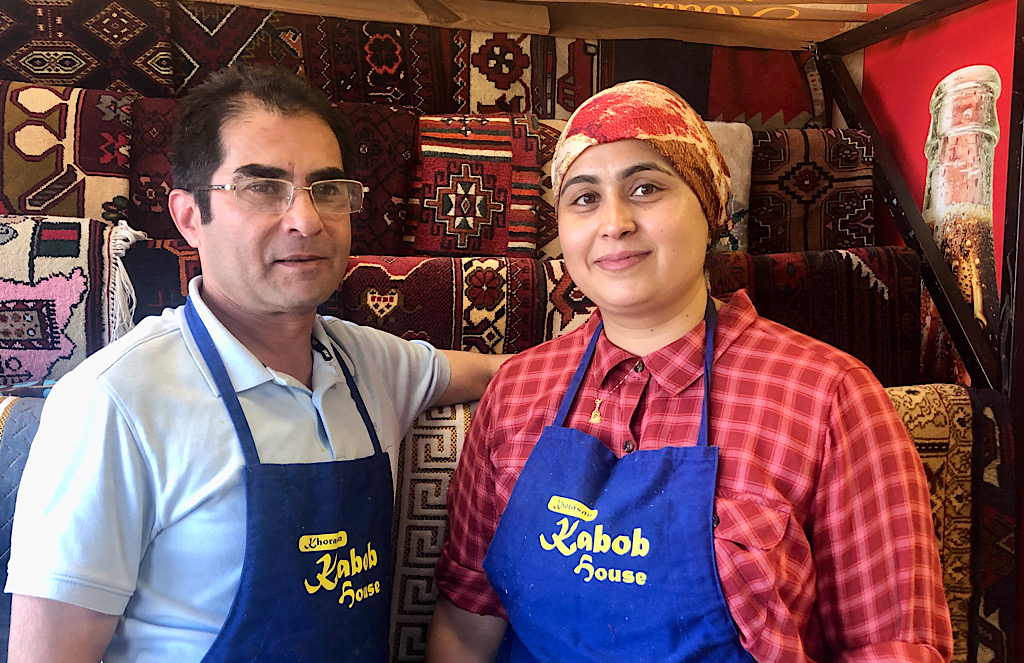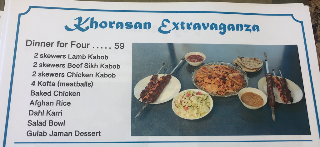 With the reopening, the couple has added a special platter to the menu: the Khorasan Extravaganza. It’s a dinner for four that includes lamb, beef and chicken kabobs; kofta, which are meatballs; baked chicken; Afghan rice; Afghan-style lentils; salad; and gulab jamun, which are fried balls of dough soaked in an aromatic syrup with rose water and spices.