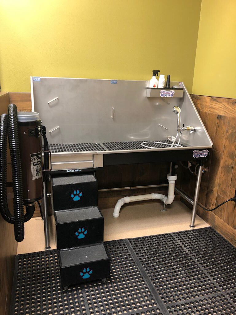 Pet owners can pay to use one of two raised wash bays, including one for larger dogs with a step stool so owners don’t have to lift them.