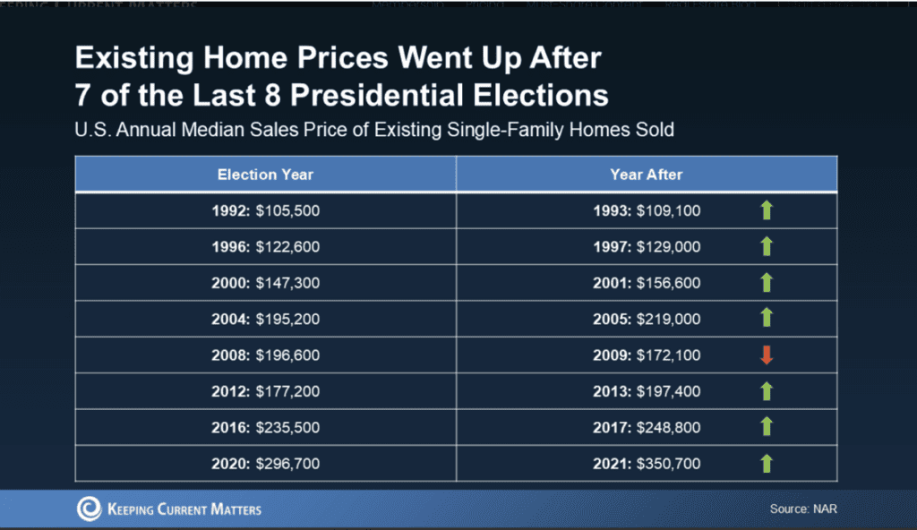 History shows that housing markets often gain momentum after elections, with home prices typically rising in post-election periods. According to the Department of Housing and Urban Development and the National Association of Realtors, home sales increased after nine of the past 11 presidential elections, and analysis indicates that prices during election years have consistently outpaced nonelection years. Securing a home before this potential upswing can provide added value in a stabilizing market, positioning you well for future equity gains.