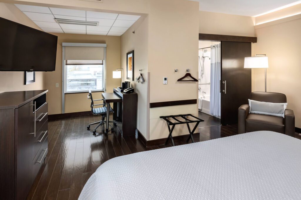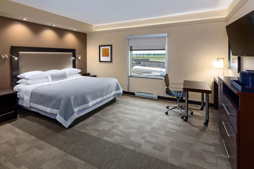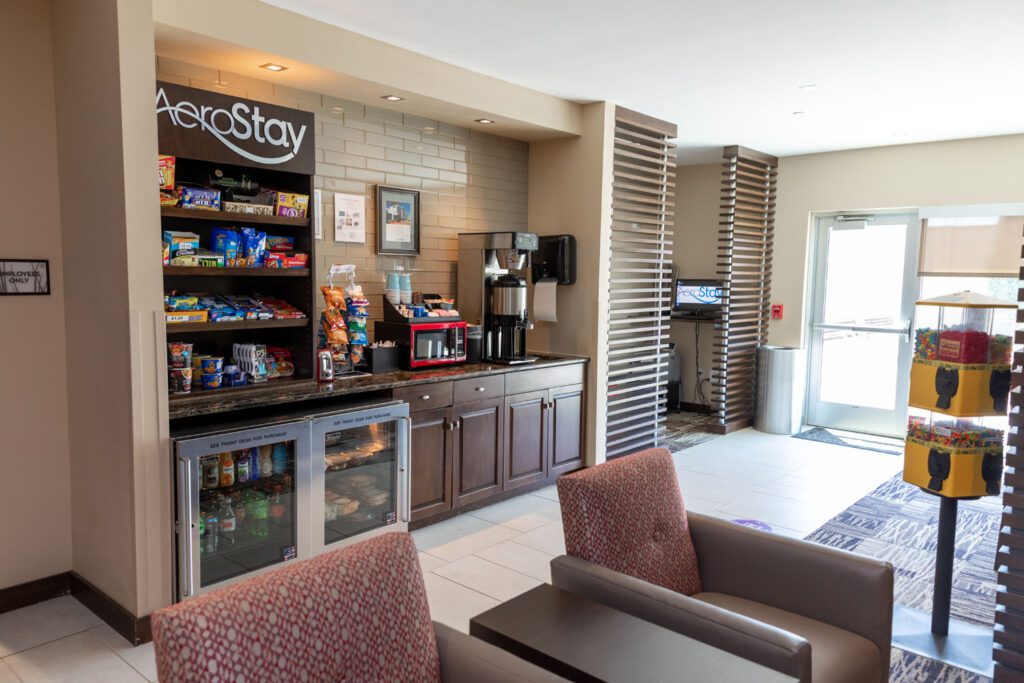 “You don’t need a lot of space because you’re here such a short time, but we still have rooms with two queen beds, so they definitely accommodate families,” Hatch said. “Plus, there’s a desk so you can get some work done and a nice television and coffee station in the room. And kids love it because you can look at the planes right out your window.”