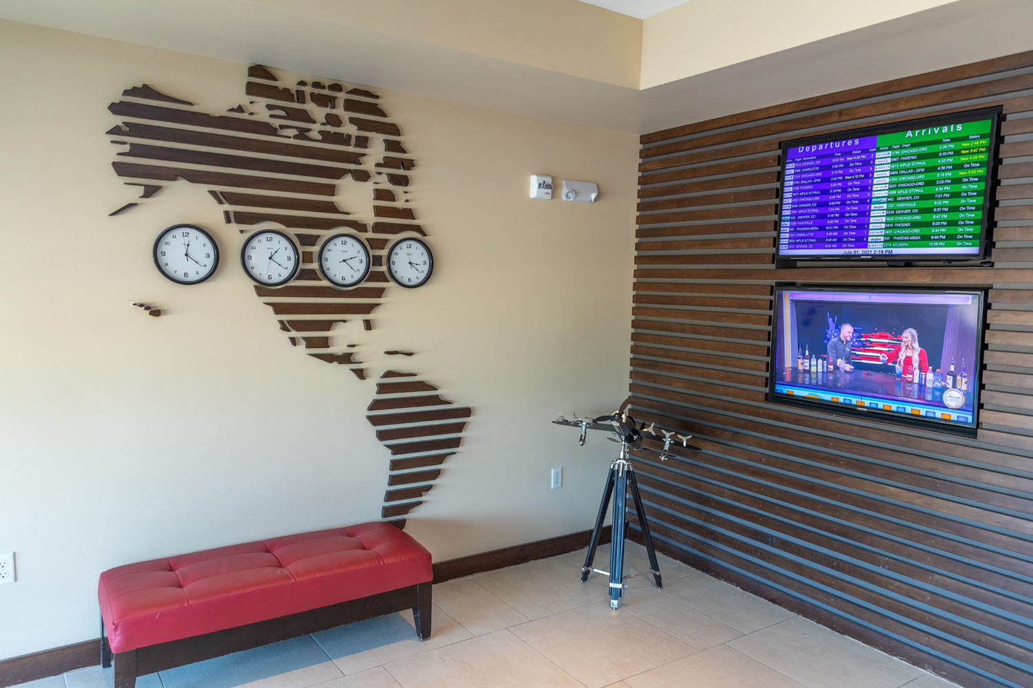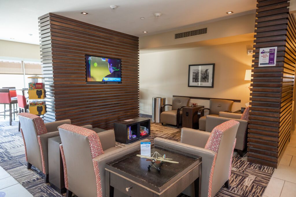 The lobby offers tall table seating, food and beverages for purchase and instant access to flight updates.