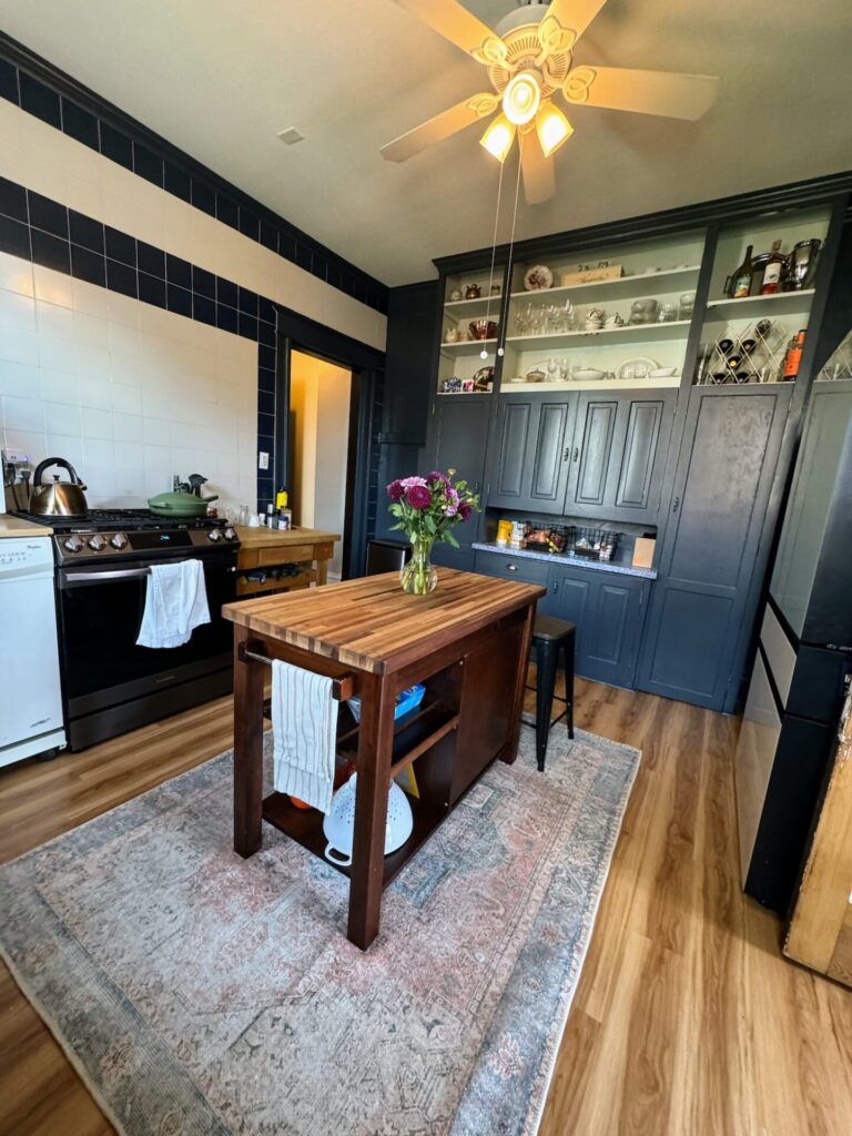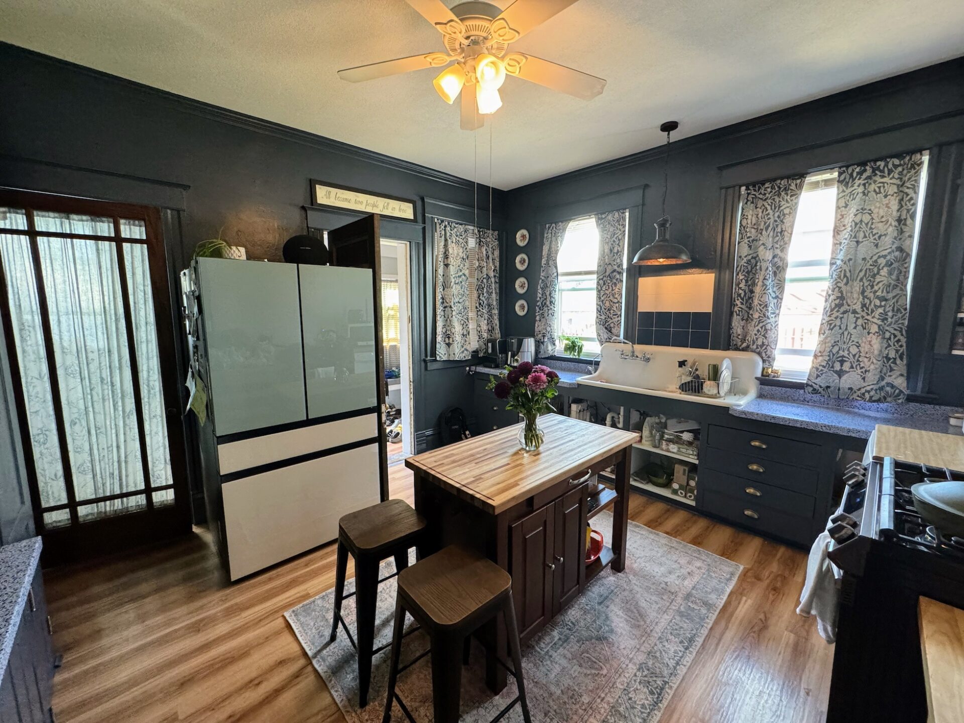 “My husband already poured a labor of love into refinishing the original hardwood floors, which look brand-new, and we’ve been tearing down some wallpaper. We remodeled the kitchen and did some light updating in the living and dining rooms. But we have big projects coming up in the next year – hopefully relocating the main-floor bath and laundry and restoring the butler’s pantry, in addition to the exterior. All the windows are original, which is amazing, but they need some love.”