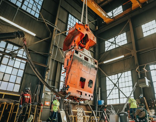 This drill rig has been disassembled to prepare it for delivery a mile underground. Before lowering any large piece of equipment, crews perform a test sling to understand how to rig the piece so it hangs properly while traveling through the shaft. Photo by Adam Gomez