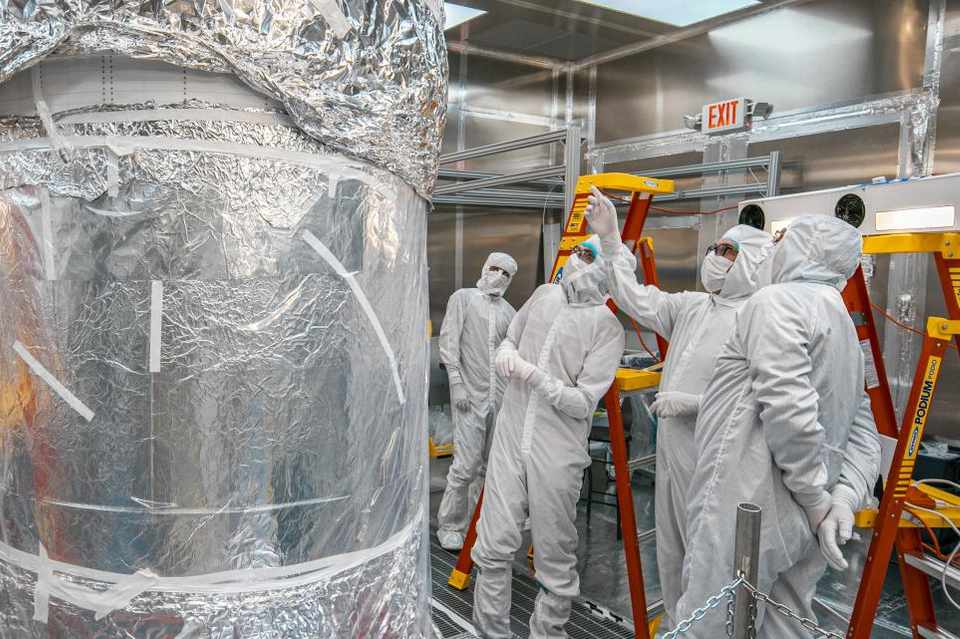 Researchers and engineers examine the aluminum foil-wrapped xenon detector in the Surface Assembly Lab at Sanford Underground Research Facility. Photo by Nick Hubbard