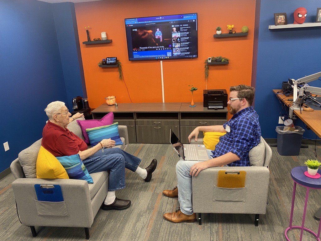 He and co-worker Becca Horan run Dow Rummel’s Link Department, which includes a physical location on the senior living community’s “Main Street” where residents can stop in to use computers, print documents, take mini-courses and, of course, get help with their technology.