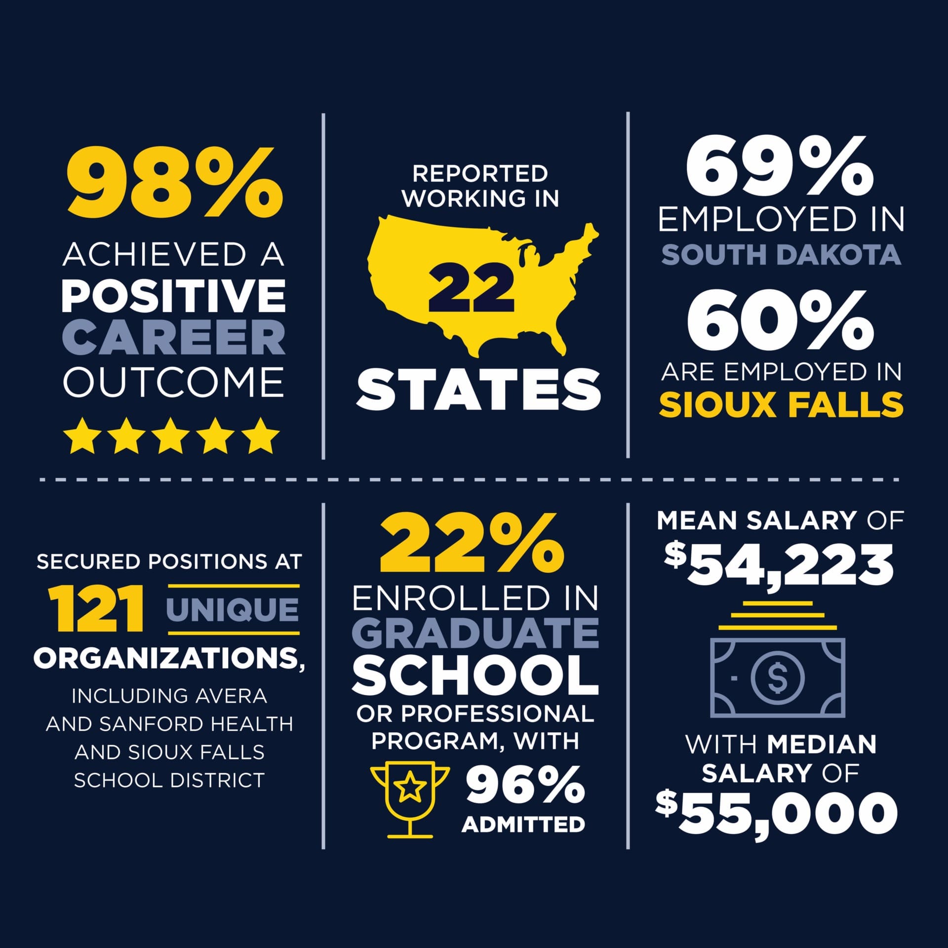 - Members of the Class of 2025 were hired by 121 unique organizations. The top employers included Avera and Sanford Health, as well as the Sioux Falls School District and RSM US LLP.