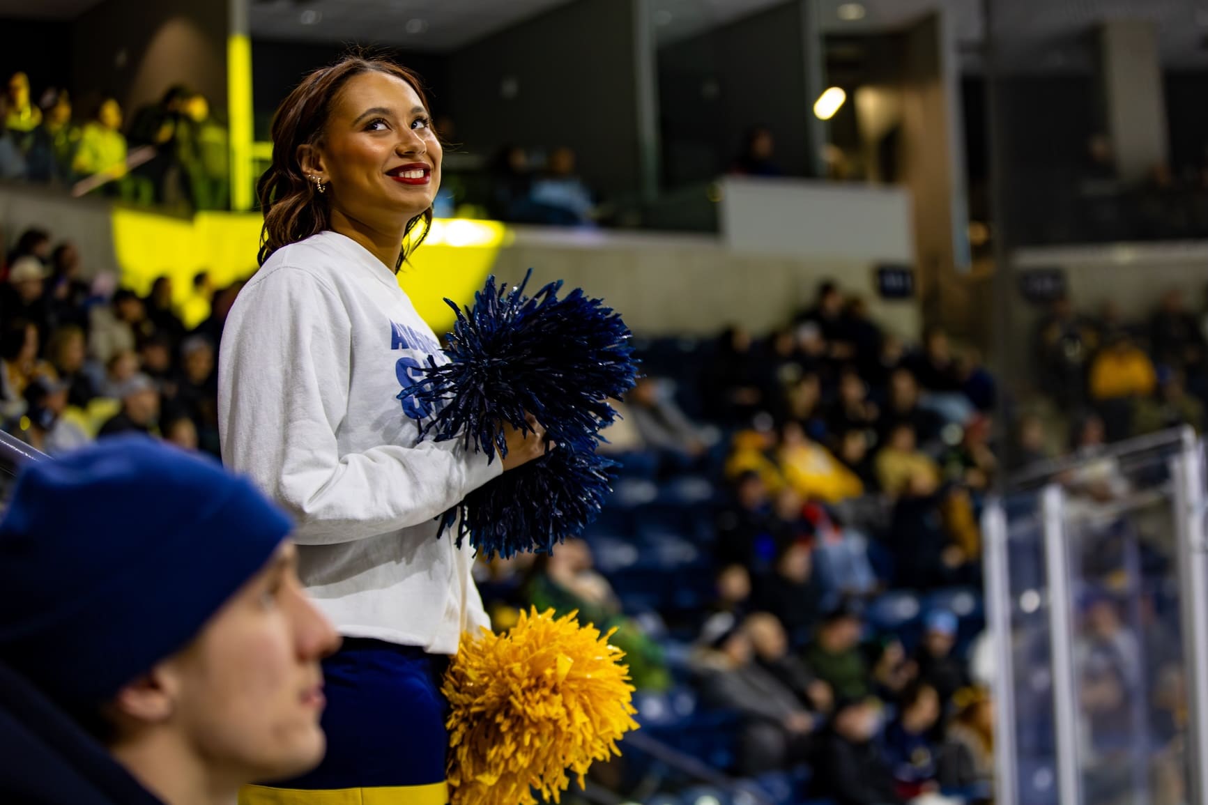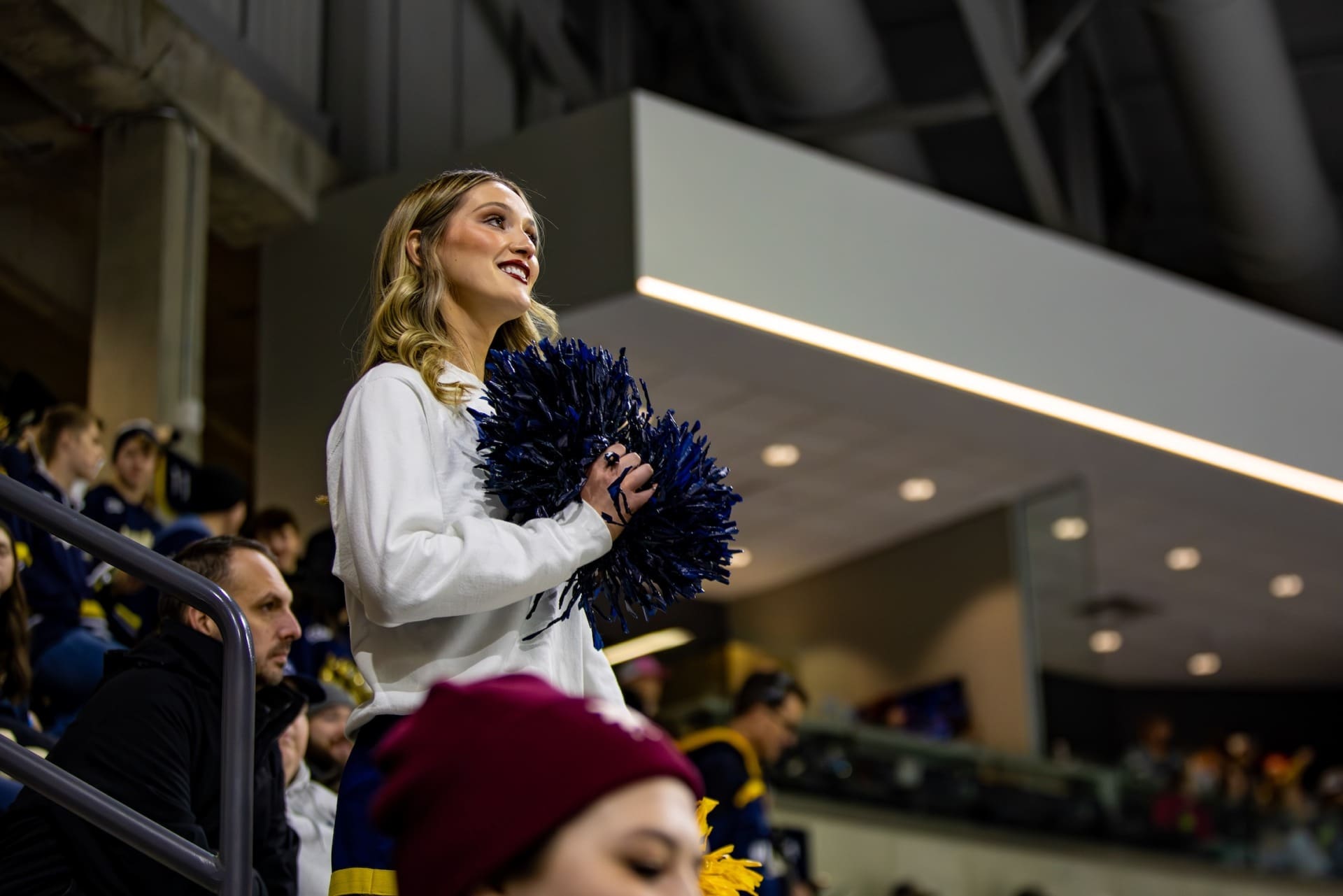 “It’s what it sounds like — combining cheer and figure skating for hockey cheerleading purposes,” Block said. “The team cheers in the stands during games. They’re part of energizing the crowd. They’re also on the ice during the starting lineup, and they’ll perform occasionally during one of the period breaks.”