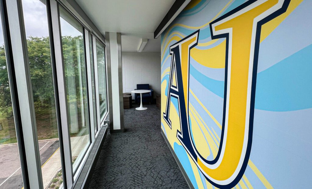 Most visible to the public along 33rd Street, balconies were eliminated from Bergsaker Hall — replaced with four stories of windows. There’s no mistaking the campus from passersby as AU branding adorns the walls, which can be seen through the windows, especially at night.