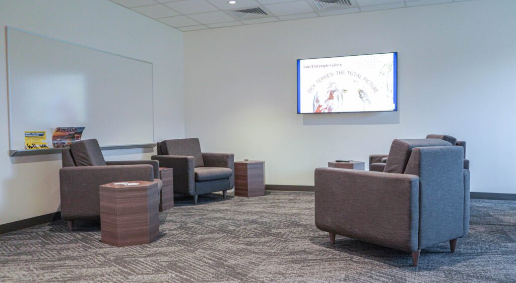 Inside the front doors, the entire Augustana community has access to a lounge area with natural light flowing in through a wall of windows. Just a few steps ahead to the left is yet another wall of windows, which includes the main feature of the building — referred to as the Jewel Box.