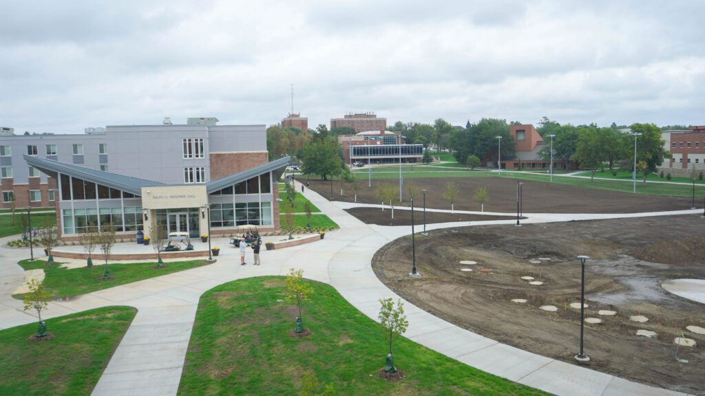 To prevent flooding, a retention pond on campus was relocated closer to Bergsaker Hall along 33rd Street and includes a water feature. The sidewalks that run alongside and between the green and academic buildings also were reconstructed.