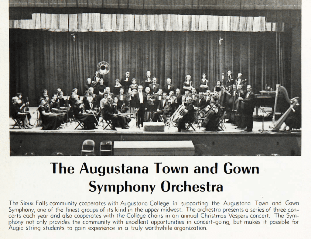 The SDSO was formed in 1922 in conjunction with Augustana College as the Augustana Symphony Orchestra, with students and community members playing side by side, and changed to Augustana Town and Gown Symphony Orchestra in 1952.