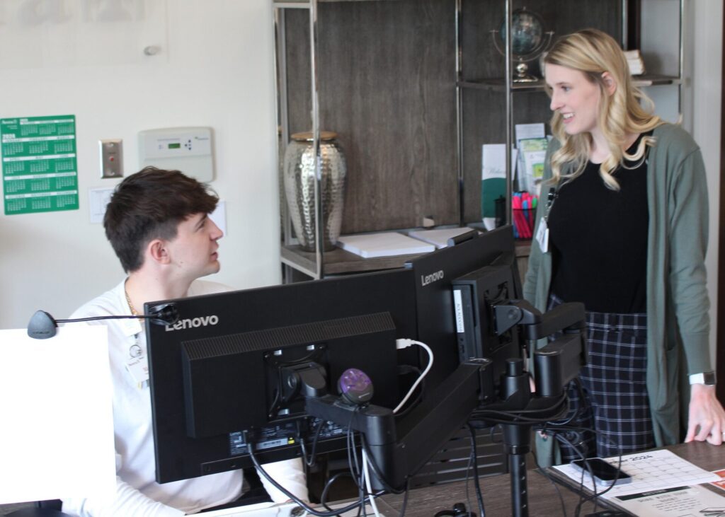 Maksym Pylypchuk, a reception specialist at the Avera Addiction Care Center, talks with Alyssa Dahl, manager of the Avera Addiction Care Center, during a recent shift.