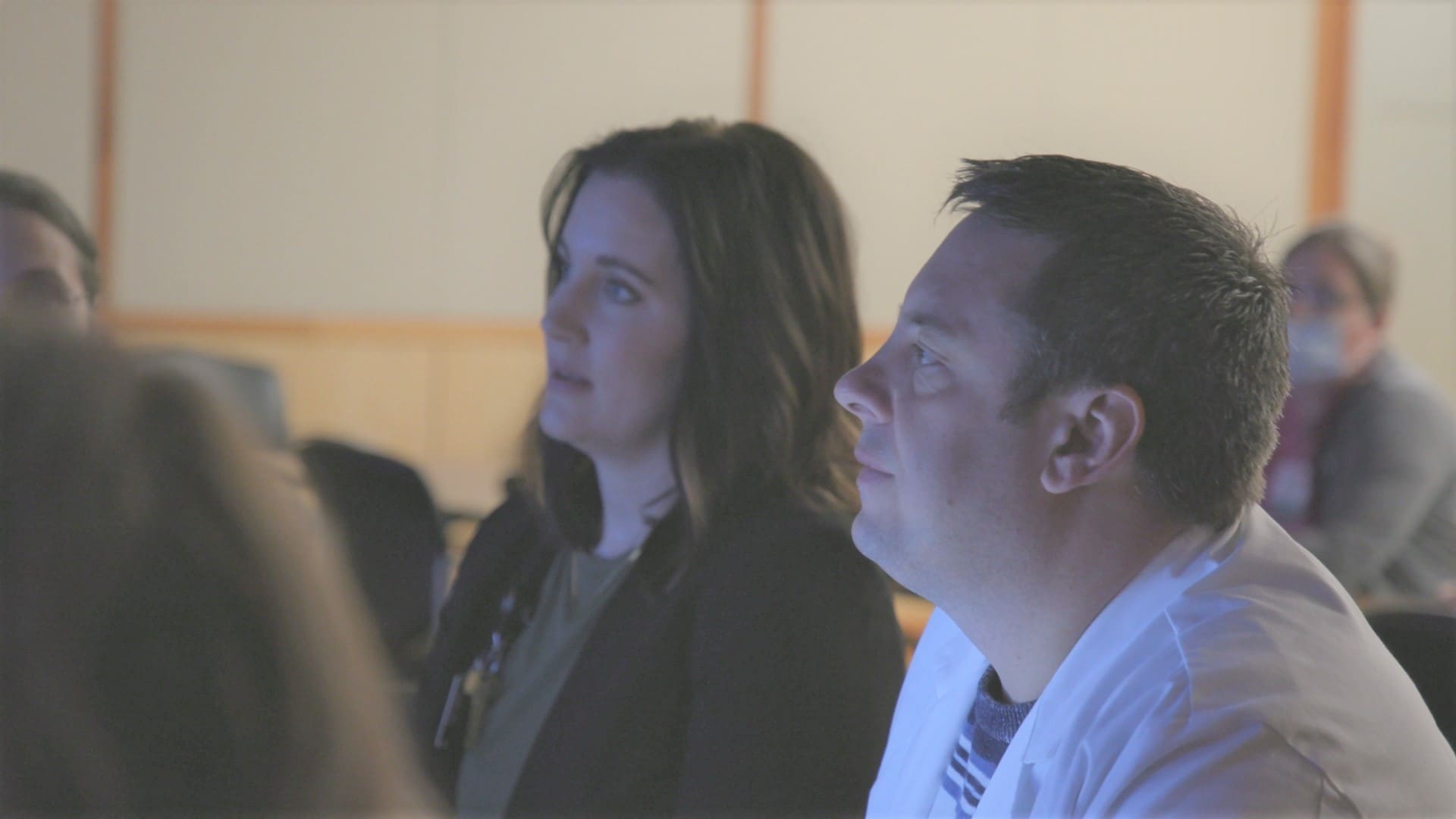 Dr. Ally Higgins and Dr. Jason Jones, breast oncologists, listen to a patient’s case being presented at a tumor-specific conference for breast cancer.