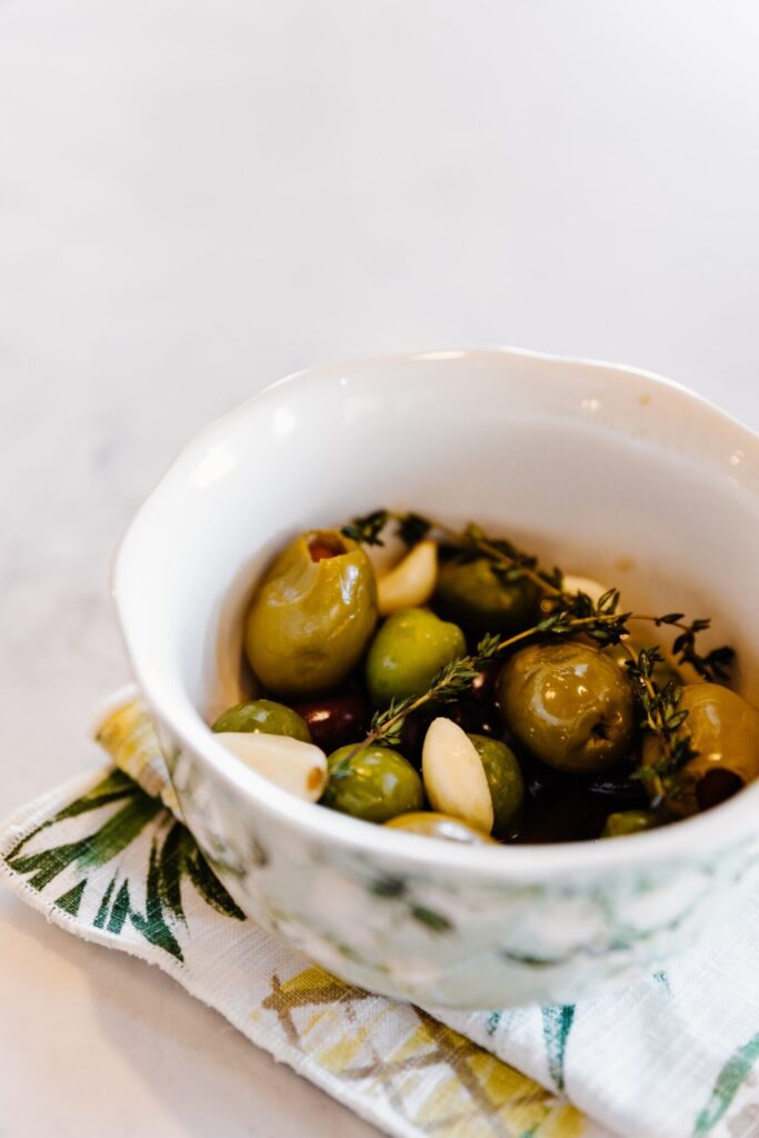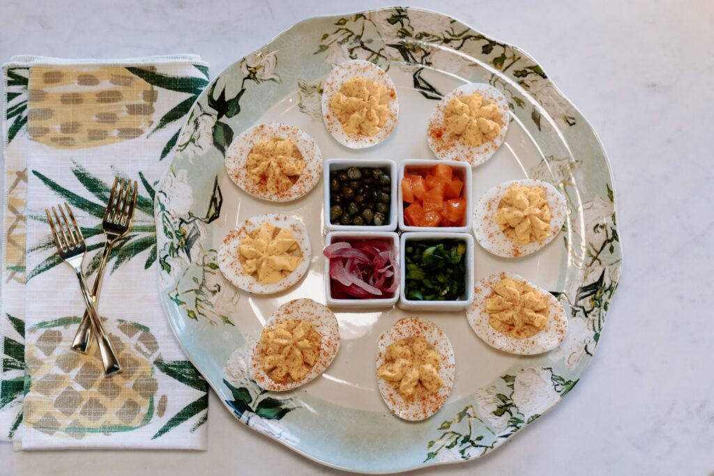 Dishes include a charcuterie, warm olives and a deviled egg bar.