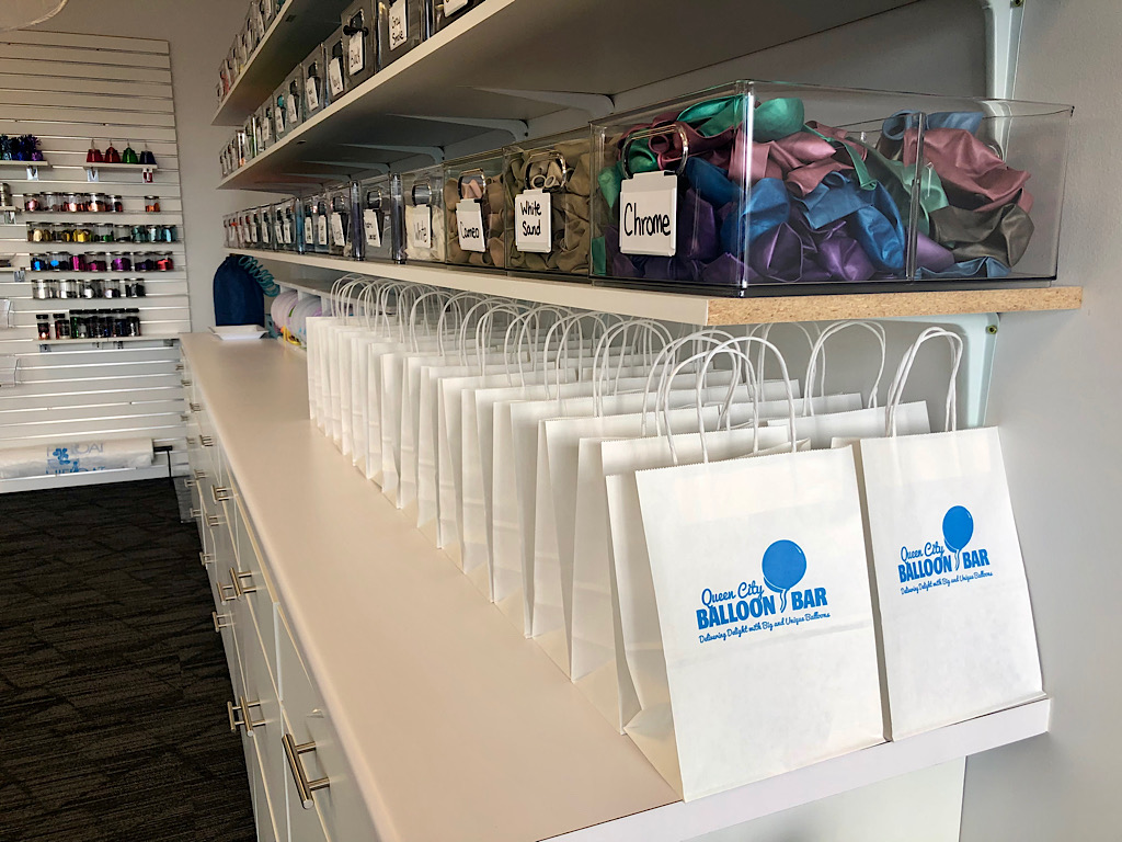 Queen City Balloon Bar offers a shopping area for customers, including a bar – but no booze – where they can sit while orders are being made. There’s also a workspace in the back for owners Ryan and Christine Egan.