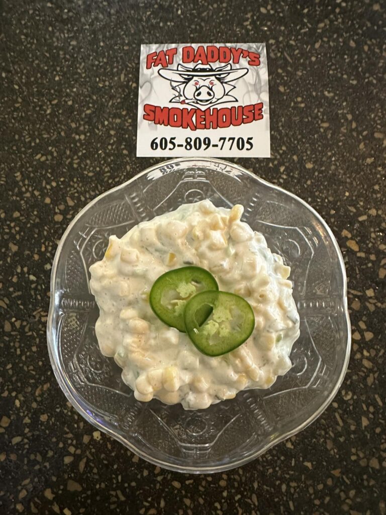Sides include fries, coleslaw, jalapeno creamed corn, baked beans, mac-and-cheese and loaded potato salad with bacon and cheese.