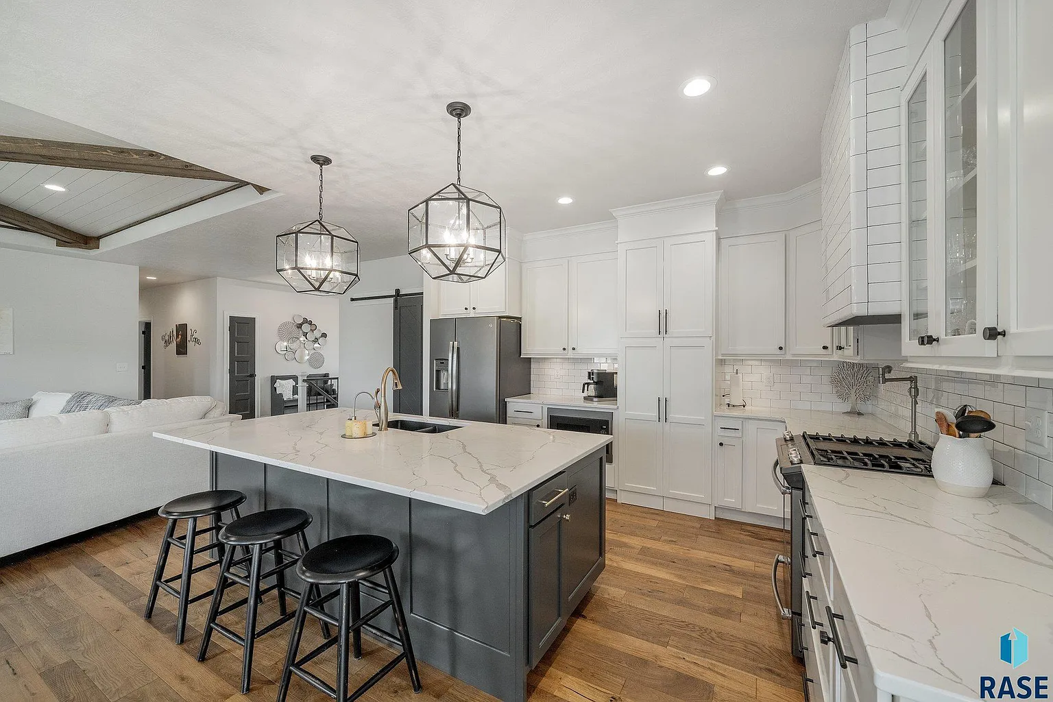 A sprawling kitchen is adorned with a generous island and convenient walk-in pantry.