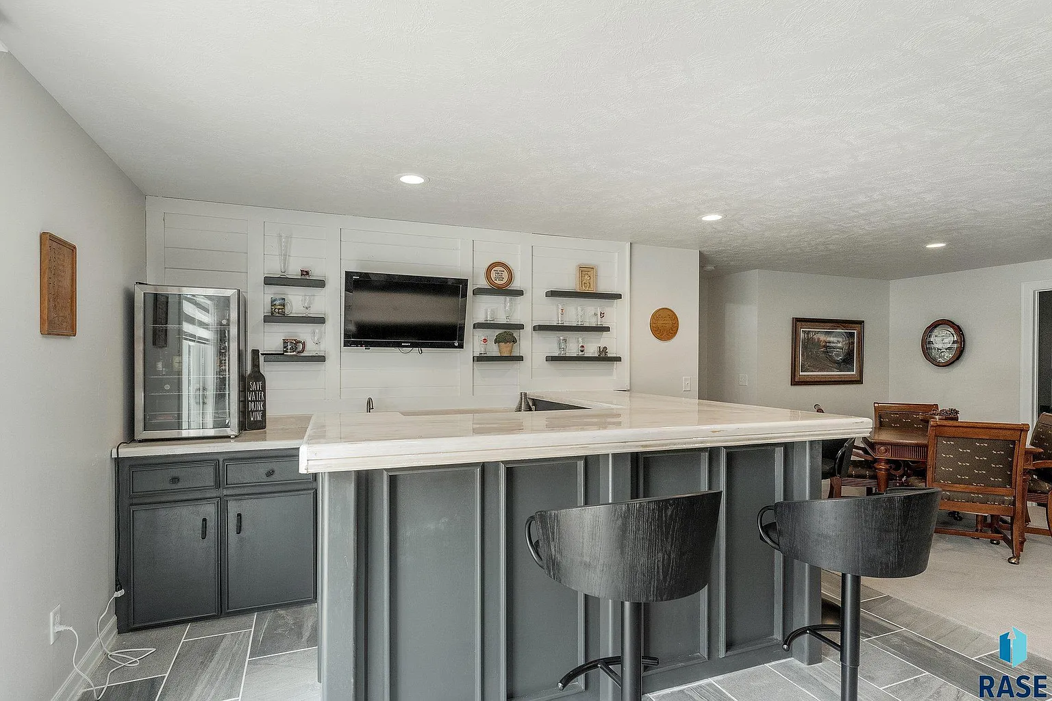 The lower-level family room, including a wet bar, is a perfect space to entertain and relax.