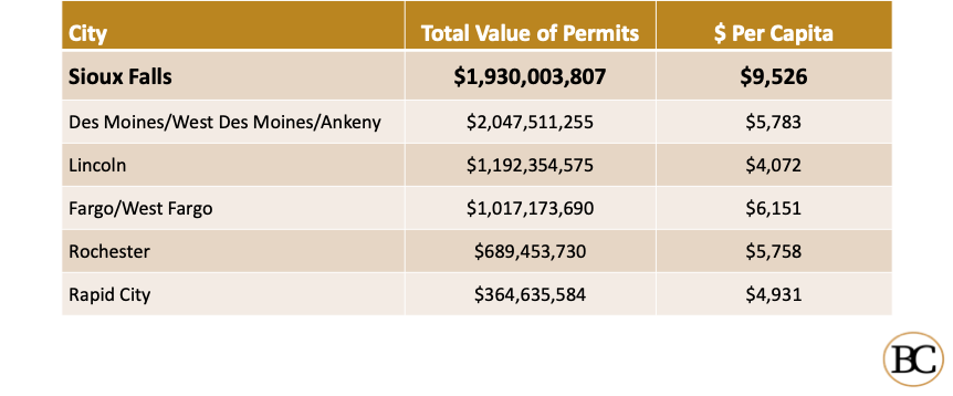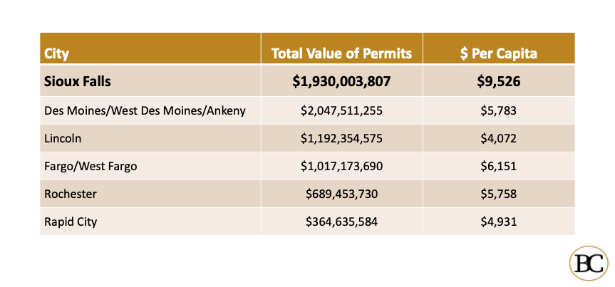 Sioux Falls’ building activity at nearly $2 billion in 2022 outpaced regional communities, especially on a per-capita basis.