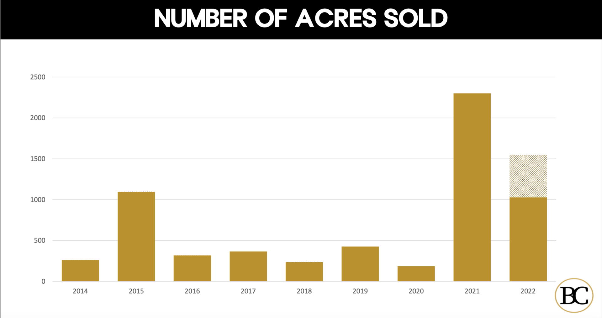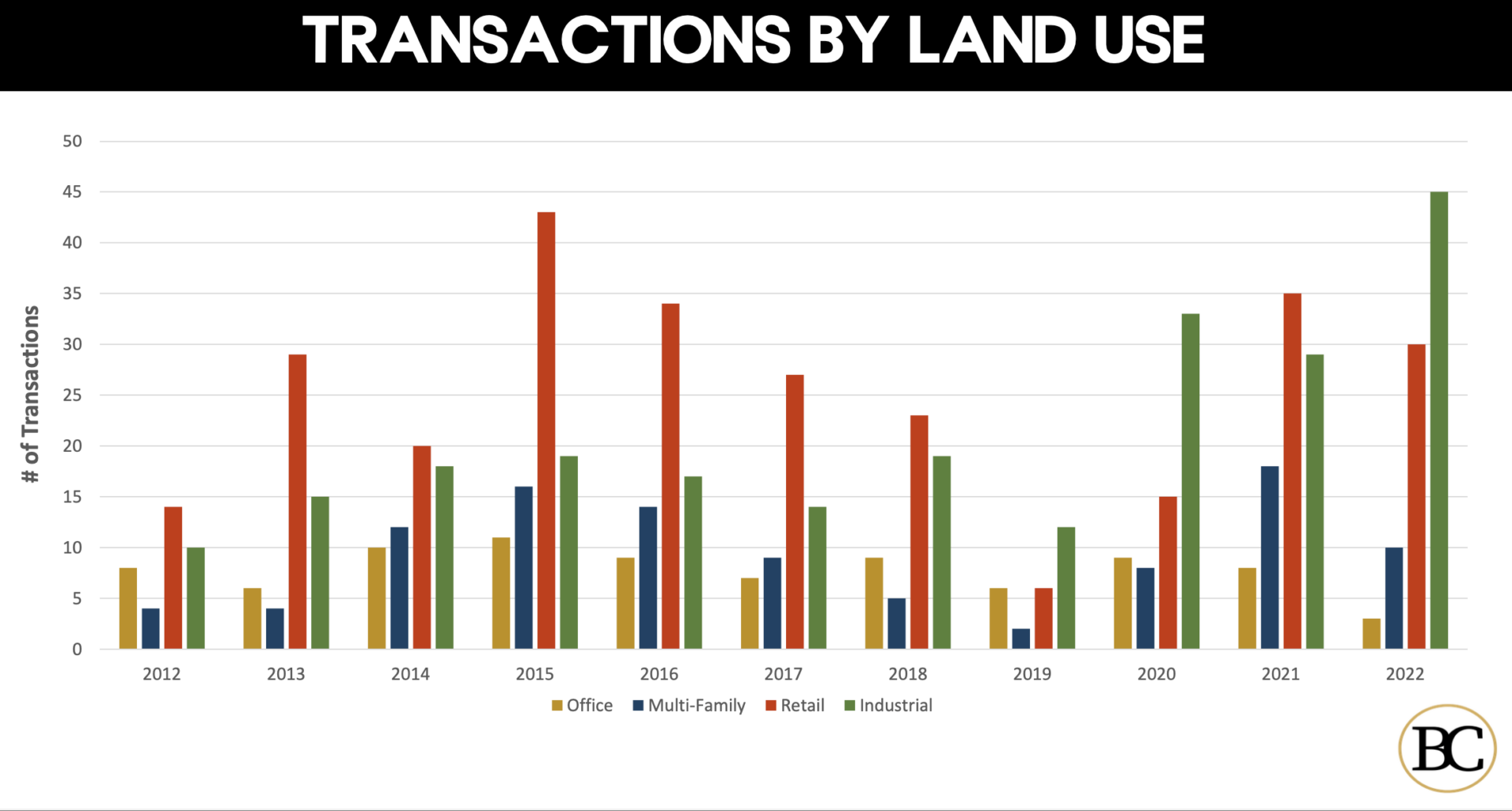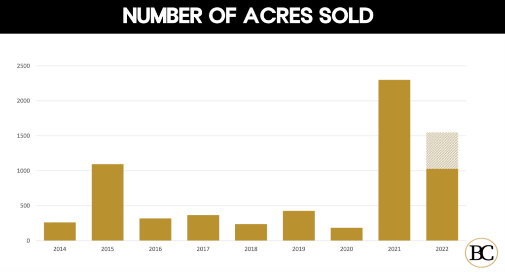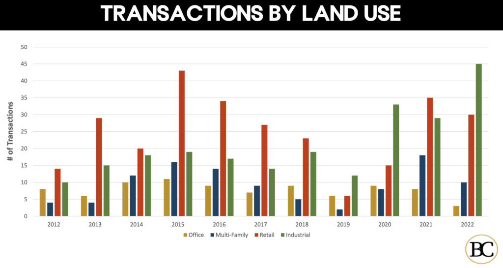 In land sales, improved land deals essentially were the same as in 2021. Office land hit an all-time low though, while industrial transactions shot up.