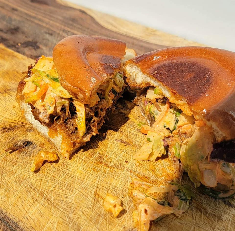 They usually offer the Road Hog, which is pulled pork with a blueberry barbecue sauce and a ginger pineapple slaw on a toasted bun, and the Dakota Dip, a roast beef sandwich served with au jus.
