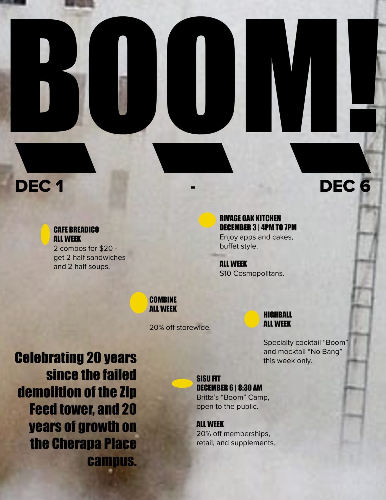 - Stop by SISU Fit all week and enjoy 20 percent of all memberships, supplements and retail items. Plus, Britta’s “Boom” Camp will get your weekend off to a great start at 8:30 a.m. Saturday, Dec. 6. It’s open to both members and nonmembers.
