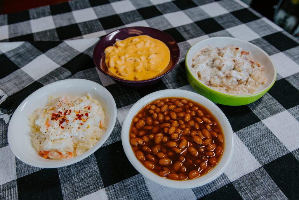 “Off-sides” include mac-and-cheese, baked beans, coleslaw and potato salad.