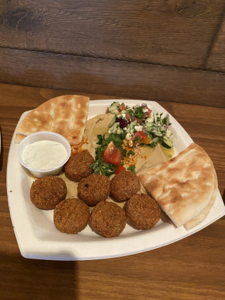 The menu is Mediterranean, with appetizers including hummus and Turkish salad, pita sandwiches and platters including falafel, beef shawarma and gyro.