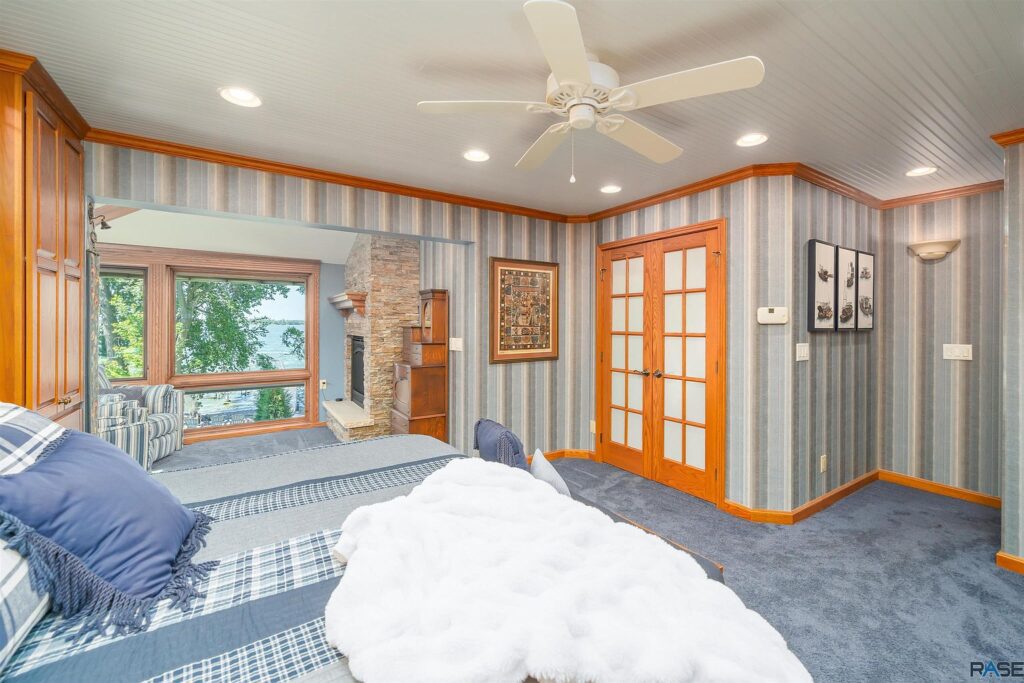 The primary suite is truly grand with a private five-piece bathroom featuring a whirlpool tub, shower and double vanities, along with a his-and-her oversized closet, as well as a sitting area featuring a double-sided fireplace and expansive views of the lake.