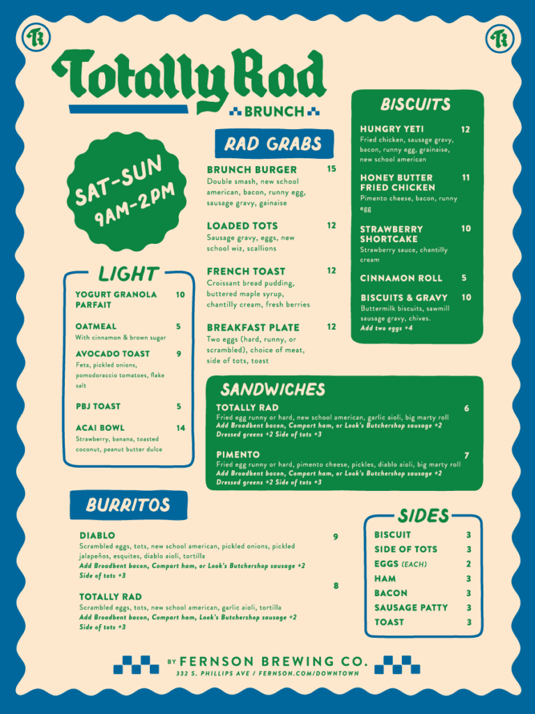 Farther south on Phillips Avenue, Fernson Brewing Co. and its food concept, Totally Rad Eats, introduced a brunch menu last weekend, expanding the hours and previous offerings for breakfast.