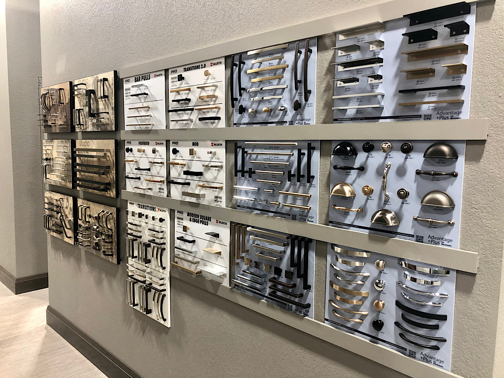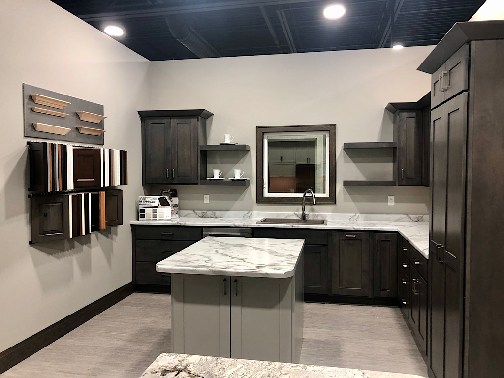 There’s a display room with options for multifamily projects, and several areas with kitchen cabinetry for single-family homes.