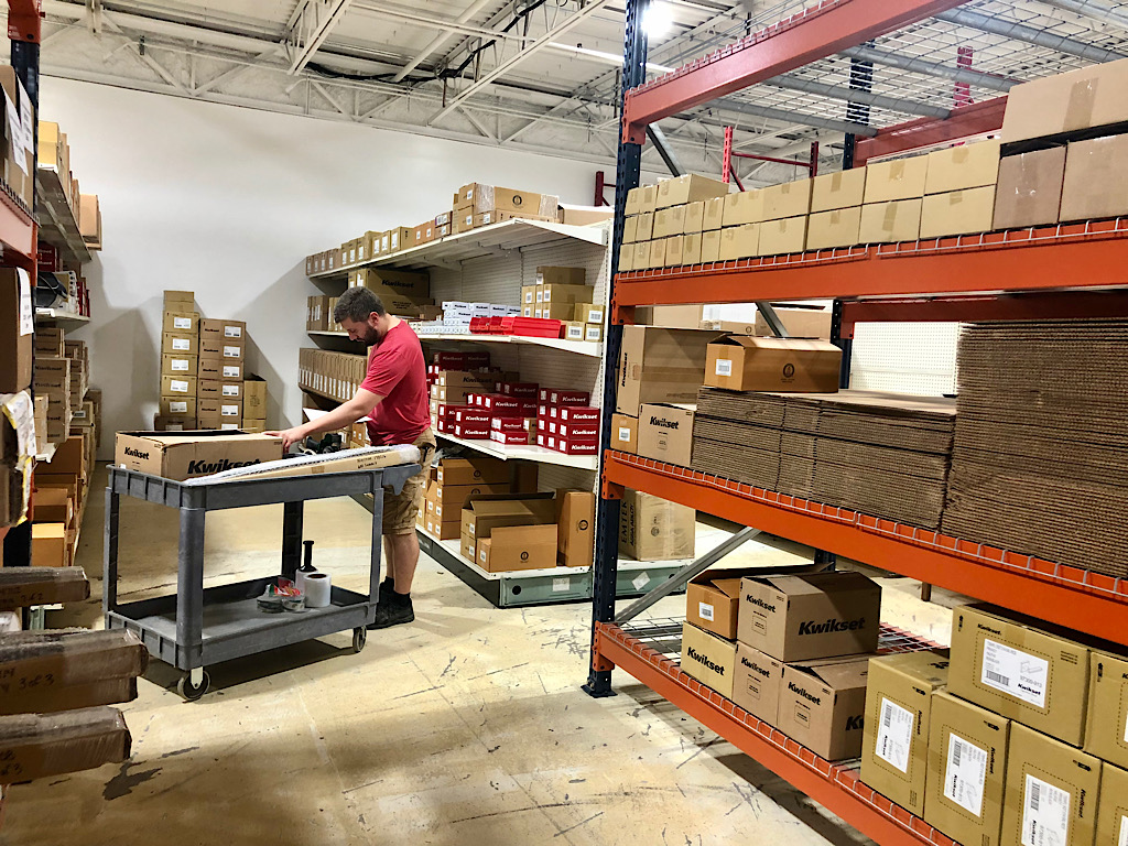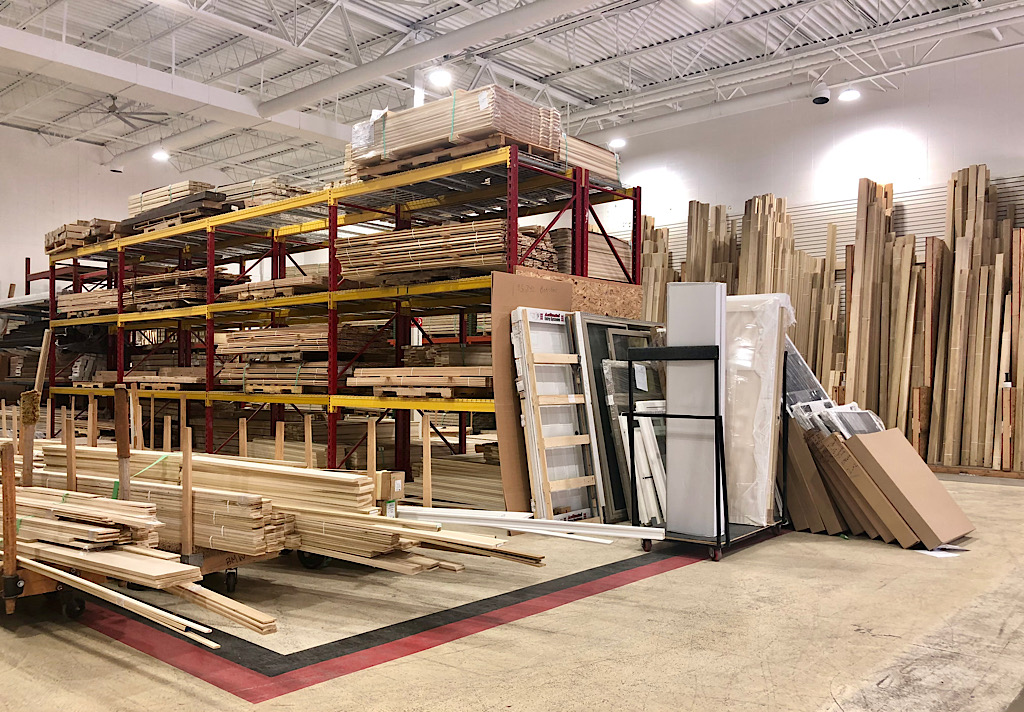 Other areas in the warehouse are stacked with millwork that the business buys in bulk and filled with shelves holding boxes of hardware such as doorknobs.