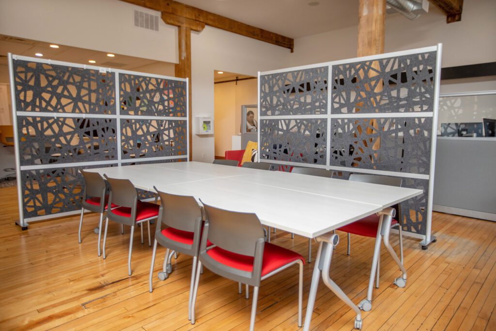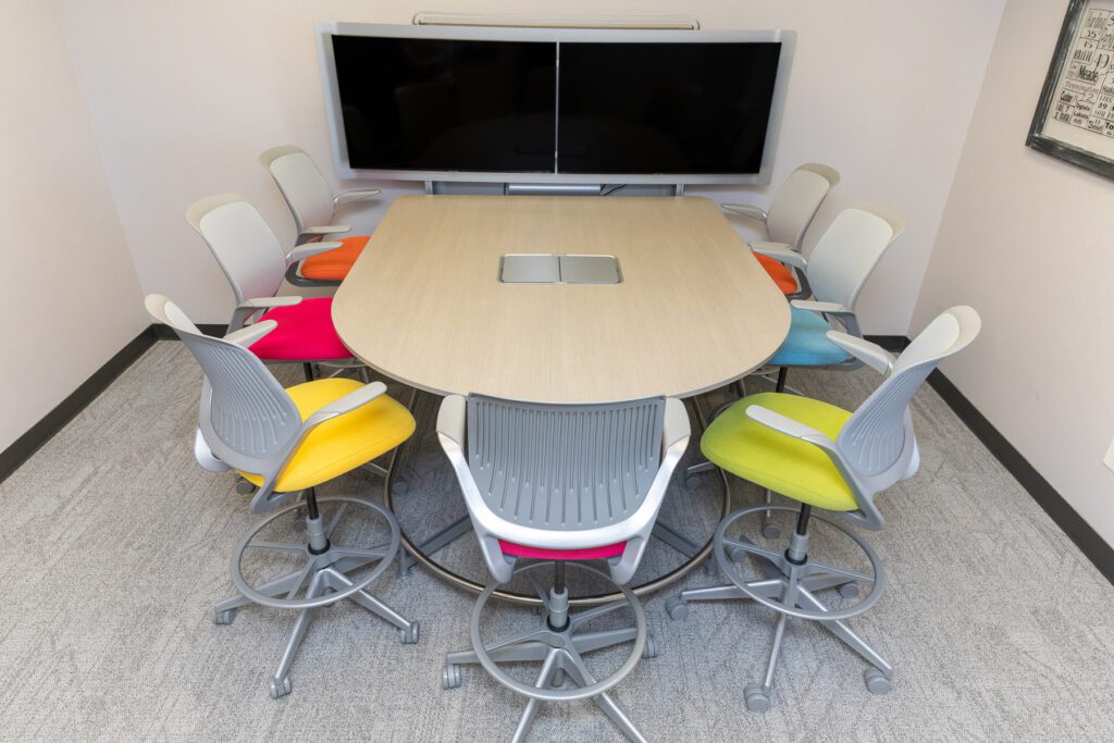 “When we saw that table we felt like it was designed for us. It’s even in a semicircle, which is how we do a lot of our work,” she said. “We have the table on one side of the room and then a wall full of whiteboards on the other side, so we can easily share screens if you have virtual things you want to share.”