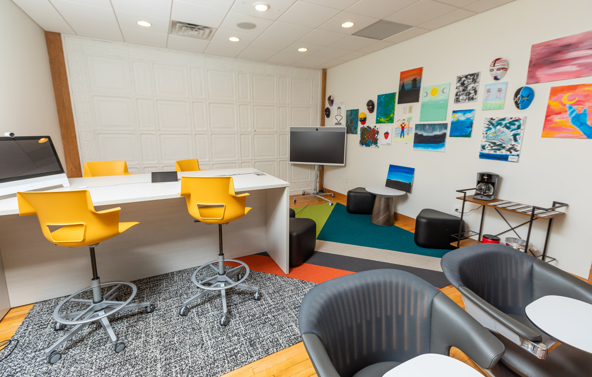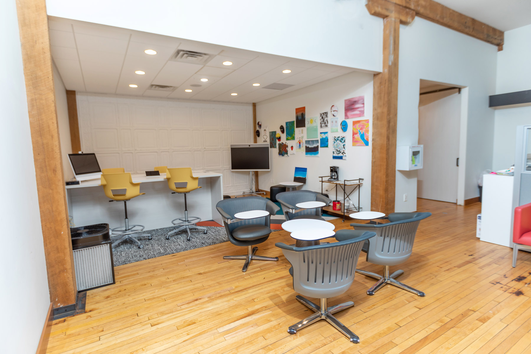 “With this, the tables and chairs are on wheels, so we can move around and configure the space, and there’s a large TV where you can meet online or in person, and we’ve used it for a virtual facilitator at one event, and it felt like we were all in the same space.”