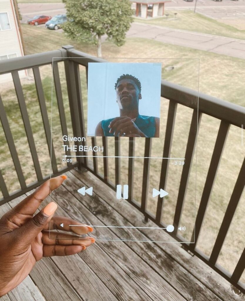 She started selling acrylic sound plates, which consist of a personalized picture on glass and then painted with a chosen song in the Spotify layout.