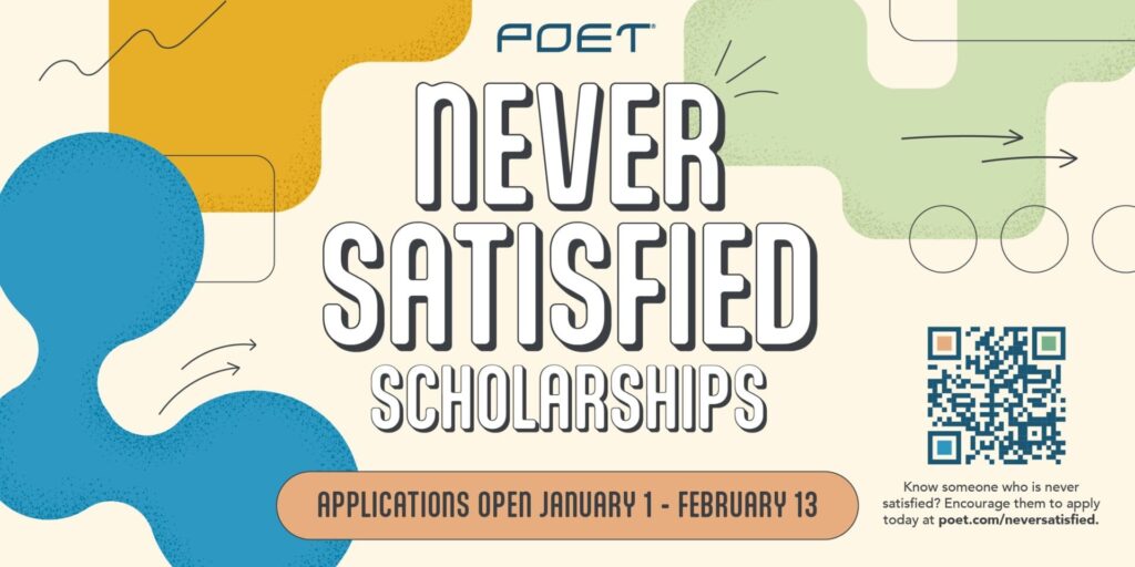 From now until Feb. 13, students across the country are invited to apply for POET’s Never Satisfied Scholarship Program. The scholarships are designed for those who refuse to settle for “good enough” and who share POET’s passion for creating a brighter future.
