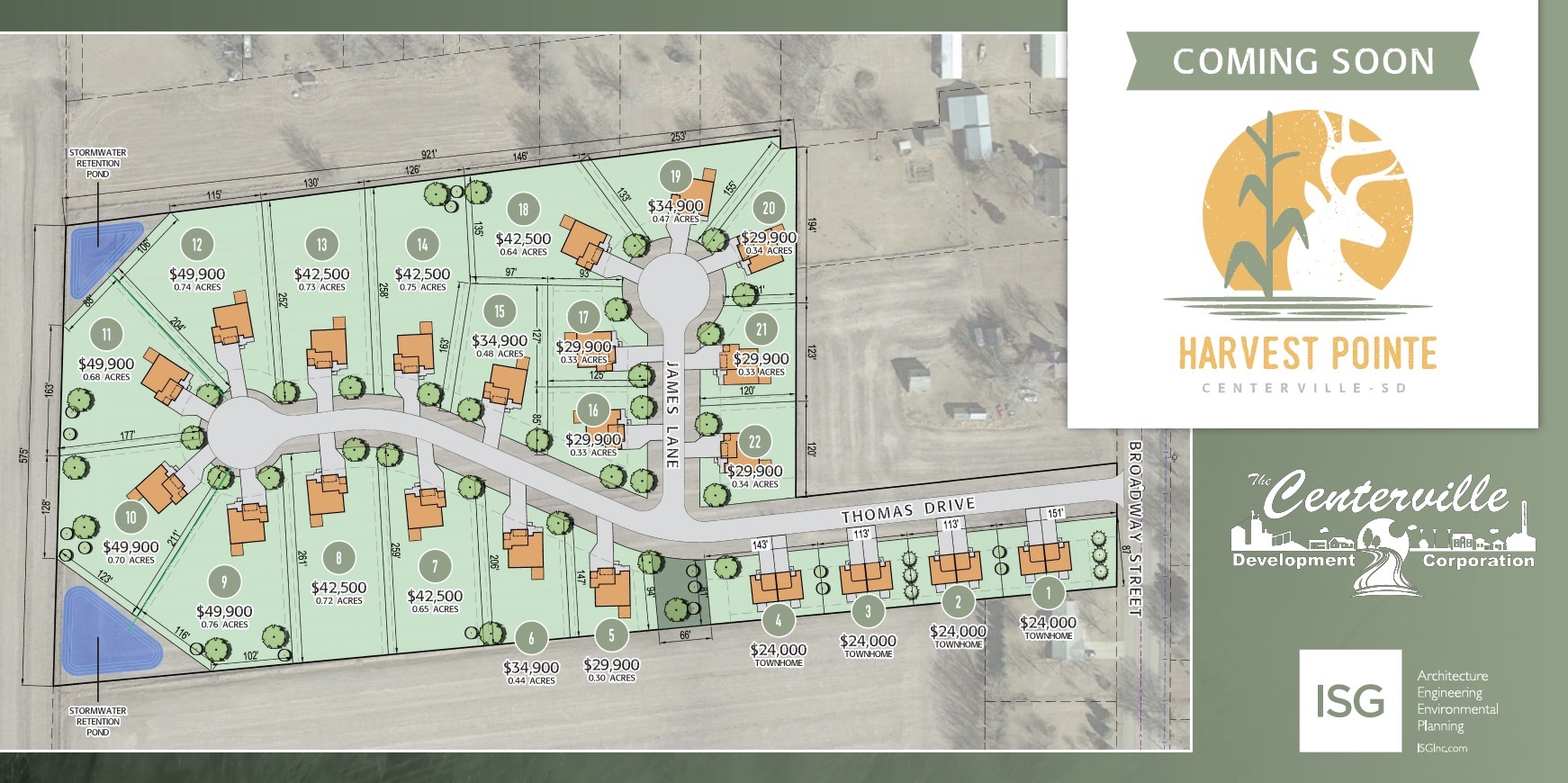 The Centerville Development Corporation owns and is developing the land and is hoping to be awarded some of the state’s available infrastructure funds to support the housing need, in addition to an economic development loan through Dakota Resources.